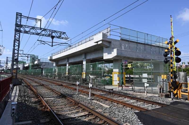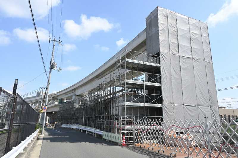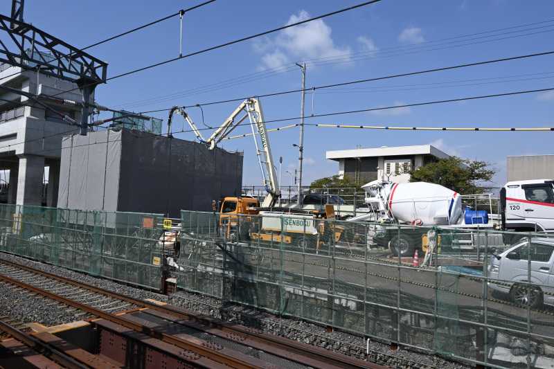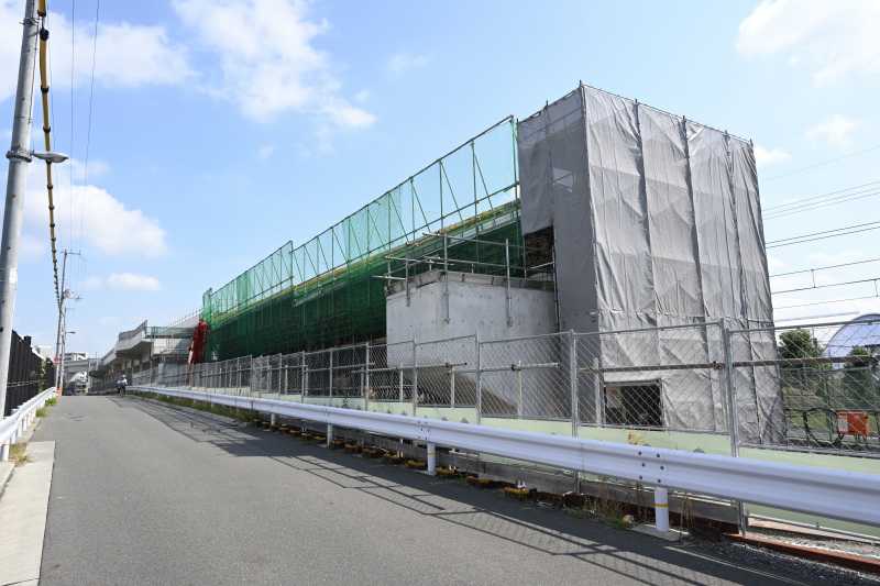 反対側は線路なのでシートが掛けられ様子がわからなくなっています。