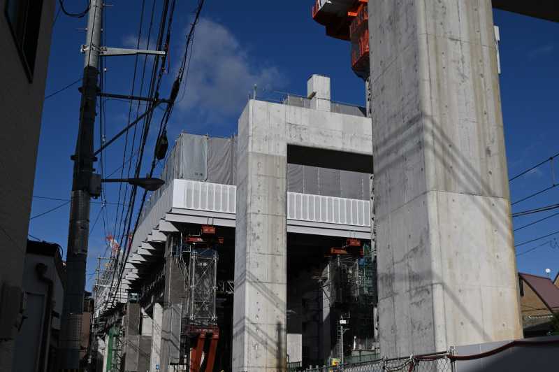 橋脚工事が引き続き行われています。梁の部分を施工しているようです。