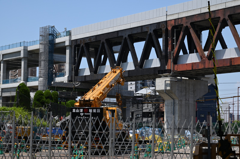 トラス上部の床工事が終わったようでトラス内にある足場の解体をしています。