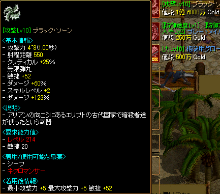 新しくカテゴリに「露店品」なんてものを作ってみました。(*ノω`)テヘッ基本的に露店で見つけた異次元品やT品などを載せる予定・・・決して俺が売ってる品じゃありません。そこをふまえてね!(・∀・)まぁ俺がこんなもの持ってるわけ無いって物ばっかだけど(・∀・)ガッハガッハでぁ記念すべき一品目~シフ武器のソーンですね。これでソーンの弱ダメクリが一気に強くなりそうです。箱小型手裏剣DXよりかなり↑なダメが期待できそうですねーこれがスプリッターだったら絶対欲しかったです。これは移動速度を異次元でつけてからエンチャしたんでしょうかね?これはいたらどんだけ速くなるんでしょねー微妙に真ん中のダークバイザーも安いですね。とまぁ・・・こんな感じで続いたら続けますね(・ω・)