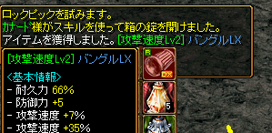 さて、2ヶ月ぶりの更新です。この放置してた期間の間赤石ではずっと箱探索ばっかりしてました。リアルではテストや音楽祭やインフルエンザ^^^^^^^^^^主に粘着してた箱狩り場は箱バングルが出るといわれた場所。塩B2~B3滝B5河口ダンジョン全域魔法傭兵全域ここらをすべてほぼ毎日回ったわけですが・・・なにもでないwwwwwほんとなんにもでてないんですよw一日1個でればいい方です。出ないときはほんと箱品すらでません。ほんとソロしてたほうがいいんじゃって感じ。二ヶ月もなにしてたんだって感じ。しかもゴエもんさんは箱探索メインの俺より先に箱バングルを!ほんとリアル運に乏しいカナード君^^;;;でもまだ諦めません。箱バングル出すまで絶対に引退しないんだから^^;とりあえず出した箱品を羅列。↑のリスト以外の場所での探索も含めます。武器[攻撃Lv4] [永久弾] トマホーク[致命打率Lv1] [最大CP効率Lv2] [攻撃Lv3] 白金の牙[健康固定] [力比率上昇Lv1] プラチナの翼[攻撃Lv4] [攻撃Lv5] スパルタ[攻撃Lv4] [攻撃Lv5] 戦闘用の弓[攻撃Lv4] [永久弾] フランシスカ[最大HP効率Lv2] [攻撃反射Lv1] 松葉の笛[攻撃Lv4] [攻撃Lv5] メタルスリング[攻撃Lv5] 強化弓DX[攻撃Lv5] [防御力効率Lv3] 鉄の牙DX[攻撃Lv4] [防御力効率Lv2] カトラスDX[攻撃速度Lv2] [攻撃Lv6] 杖LX[永久弾] [自動リロード] [火属性抵抗Lv3] ボウラスDX[風属性吸収Lv2] [火属性吸収Lv1] [フリーズ抵抗] スターワンドLX[攻撃Lv7] [防御力効率Lv4] 重い弓LX防具[防御力効率Lv3] [知識Lv3] ジャイアント兜[運固定] [防御力効率Lv5] 鉄板ベルト[薬回復Lv1] [最大CP効率Lv1] 皮のグローブDX[攻撃回避Lv2] [CPボーナスLv1] 鱗シューズDX[防御力効率Lv1] [最大HP効率Lv3] ミスリルコートレッドストーン・ウォーカーズより引用・・・ほんとにギリギリで良品すり抜けてる(´;ω;`)ウッそんなこんなで久し振りの更新終了\(^o^)/氷桜へ私書から返信返せなかったのでここに書いとく。ギルド残ってるからはやく戻ってきてくれw