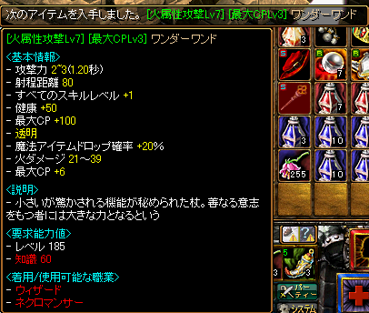 すいません、DXU実装してましたね。新装備アイテムって鞭とかそんなのとか思ってたけどこっちでいたね。すいませんそんなことは(´・ω・ノ)ノ オイトイテ露店でさっそくDXU発見しましたーCPボーナスだけなら普通にスタンチェックで良さそう。この装備LVでこれは弱い気がしますが。浮遊・・・暗闇・・・CPボーナス2%って・・・・と思ったら風ダメ23~46!!!!普通に18~36のT品、旋風ベルトに勝っています。スプシーフにはとっても欲しいですがやっぱりLVがっ。ドラクエ8でこんな名前の装備品があった気もします。結論から言うとやっぱり装備lvが半端じゃないですね。俺には無縁の話になりそうです。それに耐久力ありますが修理いくら掛かるんだ・・・追記:DXUの一覧ページ見つけました。韓国語翻訳なんでよくわからないとこ多数ですが。ヾ(´ω`=´ω`)ノ