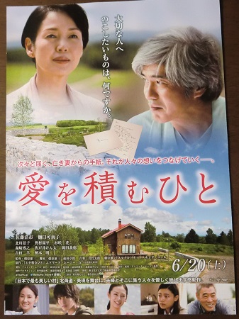 佐藤浩市主演「愛を積むひと」を見てきました。「スポーツ報知特選試写会」というのは仙台ではほぼ2か月に1回開催されているのですが、2006年の第1回から、出演者の舞台挨拶なども含めまして、今回で53回目になりました。というお馴染みの口上を、毎回上映前に報知新聞の宮本さんが出てきて話されます。それが、いかにも毎回同じことを言っています…という感じの話し方をするんです。確かに、53回もやっていればそうなってくるかも今回宮本さんは、自分は号泣したと言ったんですね。ハンカチをご用意くださいと。そう言われて逆に…だったかもしれないけど、確かに感動はしたけど、私は号泣ではなかったです。白髪の佐藤浩市さんも渋くて良かったし、自分の死期を悟っている樋口可南子さんのすべてを包む優しさも感動でした。何よりも良かったのは若い二人の俳優さんたち。野村周平さんと杉咲花さん。最近よく出ていますよねドラマ「夜行観覧車」の時にすごいと思った子役だった杉咲花さん、大人になりましたね。野村君は無口で愛想のない若者を演じたら秀逸ですね。柄本明さんが出てくるたびに笑っていた私の右後方のおばさまたち(私たちも十分おばさんなのですが)はうるさかったけど、柄本さんは出てくると可笑しかったのは事実です。でも、上映中にああいう風に声をあげて笑われると少しむかつくんです。6月20日公開の映画です。感動作です。ぜひ皆さんもご覧ください。こっちも見てね「いけばな日記」にほんブログ村 いつもありがとうございます。今日もポチッとお願いします