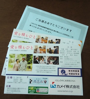 すでに16日に当選メールが来ていたのですが、試写状が届きました今年2度目の「スポーツ報知特選試写会」の当選です。今回は協賛企業・写光レンタル販売さんからの当選です。本家のスポーツ報知の方でも応募していたのですが、こちらは今回は外れたのでしょう。仙台では2か月に1回のペースで開催されている「特選試写会」ですが、2006年からだったと思います。たぶん2010年くらいまでは年間6回中5回は当選して行っていた気がするのですが、最近は減っているので、きっと皆さんの知るところとなり応募が多くなったのでしょう。それと、会場かな。今回もMOVIXなのですが、以前は東京エレクトロンホール宮城とイズミティ21のどちらかだったので、収容人数が多いと思います。今はエレクトロンホールかMOVIXのどちらかになったので、映画館の場合は2日間開催にしていますが、人数が少ないのではないかと思っています。映画館の場合指定席を取れるので開場前から並ばなくていいのと、会場の席の傾斜が大きいので見やすいという利点はあるのですが。今回は、佐藤浩市さん樋口可南子さんという熟年夫婦は年齢も近いし、北海道の美しい景色も楽しみですこっちも見てね「いけばな日記」にほんブログ村 いつもありがとうございます。今日もポチッとお願いします