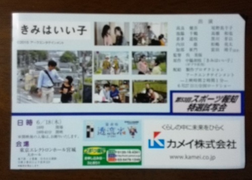 5月末から4週連続の試写会スポーツ報知特選試写会「きみはいい子」を見てきました。今回の会場は「スポーツ報知特選試写会」ではおなじみの東京エレクトロンホール宮城でした。また例によってスポーツ報知の宮本さんが出てきていつものお話をして、今回で53回目となる試写会の説明をしました。そして恒例の抽選会。入場の時に入口で配られる袋に、映画のチラシや協賛企業のチラシなどいろいろなチラシが入っているのですが、その中の1枚に「スポーツ報知」のハンコが押してあるものが当たりです。今回は5名だそうです。実は、何年前か忘れましたが1度当たっています。映画のプレスシートを頂きましたそして、映画ですが・・・宮本さん曰く、原作は短編集らしく、その中の3篇の話が同じ町の中で同時に起きているように作ってありました。だから、主演の高良健吾さんと、尾野真千子さんは接点はなく、別々のストーリーの中にいました。日本中のそこここの町であるかもしれない普通の生活の中に潜む問題点を切り取った作品ですね。今回ここまで続けて試写会を見て、スポーツ報知も5月は映画館だったので、映画館がいかに見やすいかと実感しました。東京エレクトロンホール宮城は以前は宮城県民会館と言った、座席のあるホールではたぶん仙台で一番大きくて、その割にステージ上に作られているスクリーンが小さいのですね。今回案外早く行って並べたので、映画館と違って傾斜が緩やかなので前の人の頭が視界に入るのはどの高さでも同じなのですが、見るのにちょうど良さそうな高さの席が取れたと思ってみていましたが、最後のエンドロールの時に出演者の名前が読みにくいほど小さいと思いました。友人と、「洋画の時は早く来れても見やすい高さとかではなく、字幕を読むためにもっと前じゃないとだめだね」と話しました。それと、スクリーンが小さいとストーリーに入り込みにくいということも分かりました。「スポーツ報知特選試写会」は年に6回のうち3回はここなのですが、最近は映画館も使うので、尚その差を感じてしまったのかもしれません。まあ、ただで見せていただくので、どこでもいいのですがその分いつも友人と映画の後、食事を楽しんで帰ってきます。だから帰りは結構遅くなり、毎週となると出にくくなったりもするのですがこっちも見てね「いけばな日記」にほんブログ村 いつもありがとうございます。今日もポチッとお願いします