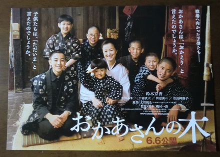 先日当選した試写会「おかあさんの木」を見てきました。 とても悲しいお話でした。今年は戦後70年ということで作られた映画かもしれませんが、8月頃の公開ではなく今なんですね~。6日土曜日から全国公開です。7人もの男の子を生み育てながら、全員が順に戦地に駆り出されていくかわいそうな母親を鈴木京香さんが見事に演じていました。その当時、年が近い子供を何人も持った人はみんな戦地に…ということは確かにあったかもしれないですね。今は平和な時代で良かったとつくづく思います。結婚当時の若いころを若い女優さんが演じて、何人目かの子供を産むころから鈴木京香さんに代わったのですが、旦那さんはずっと平岳大さんなのに少し違和感ということは早く亡くなるのかな……と予想が付きましたが、それならもっと若い俳優さんならわかるけど、平さんが演じられる若いころ、鈴木京香さんの若作りでは無理だったのかなKHB東日本放送主催の試写会でしたが、東日本放送は今年40周年らしく、今回頂いた封筒にはKHBのファイルと飴が入っていました。 映画の時って咳き込んだりすると迷惑だから、結構いつも飴は持っていくのですが、いただいたのは初めてですねこっちも見てね「いけばな日記」にほんブログ村 いつもありがとうございます。今日もポチッとお願いします
