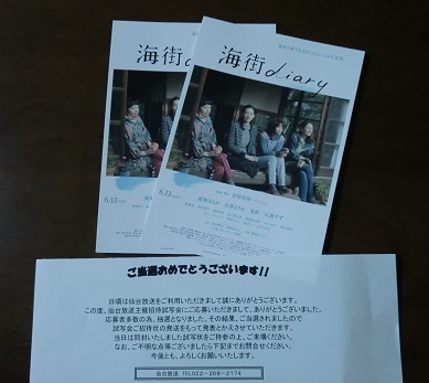 当たる時には続くと先日2つ目が当たった時に書きましたが、また当たりました。きょうはが届きました。仙台放送さんから「海街diary」の試写会です。来週の水曜日です。これで今回は3週連続ですが、1月は1週間のうちに3作品当選で見に行きましたから、それよりは散らばっているけど続けて当たりますよね。2月~4月は1本も当たらなかったので、もっと均等に当たってくれた方が、夜の試写会、家族の手前見に行きやすいのですが。カンヌで話題の映画ですよね。楽しみですこっちも見てね「いけばな日記」にほんブログ村 いつもありがとうございます。今日もポチッとお願いします