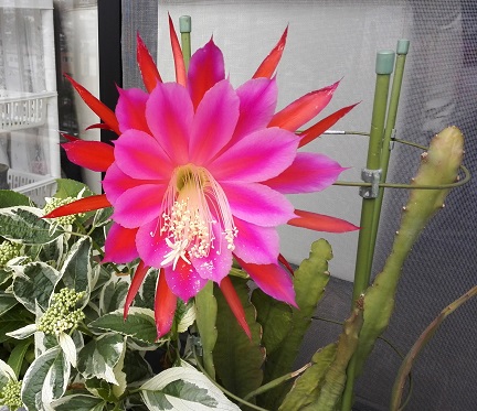 孔雀サボテンの花が咲きました。これは数日前に撮った写真で、この花はもう終わりました。この春いくつか咲きましたが、これが一番きれいに咲いたので写真を撮りました。仙台では外で冬越えはしないので室内に入れるのですが、実は私は棘のあるサボテンを室内に入れるのが嫌いで、ギリギリまで外に置いて、春は早く外に出そうとするので、室内の時についていた蕾がいくつかだめになって、早く出しすぎたと主人に言われていましたので、きれいな花が咲いてほっとしています。というのもこのサボテンは主人が数年前何方からかいただいて来たものだったんです。こっちも見てね「いけばな日記」にほんブログ村 いつもありがとうございます。今日もポチッとお願いします