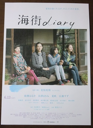 先日当選した仙台放送招待試写会「海街diary」を見てきました。 今週土曜日公開ということで、今週は宣伝のためにいろいろなバラエティ番組でこの4姉妹を見かけています。先日は「SMAP×SMAP」にも出ていました。明日は「VS嵐」にも出るらしいですね。 数々のマンガ賞を受賞のベストセラーコミックを是枝裕和監督が映画化、カンヌ映画祭でも話題の映画です。舞台の海街は鎌倉で、しかもドラマ「最後から二番目の恋」でキョンキョンと中井貴一さんがいつも利用していた同じ駅だったりするのですが、父親が亡くなって腹違いの四女すずちゃんが残された田舎の町、山形県という設定の場所はエンドロールを見たら、撮影は宮城県内らしいのです。七ヶ宿町と丸森町の名前が載っていました。そして、三姉妹を捨てたお父さんがすずちゃんのお母さんと再婚して暮らしていたらしい場所は仙台ということで、私たちにしたら、かなり親しみのもてる映画でした。そうそう、樹木希林さんが出てらして、この方、同時期にどれだけの映画に出ているんだとびっくり菅野よう子さんの音楽も、海風のように爽やかに、時に切なく、とてもきれいな曲が多かったです。 こっちも見てね「いけばな日記」にほんブログ村 いつもありがとうございます。今日もポチッとお願いします