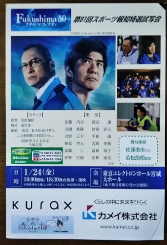 スポーツ報知特選試写会「Fukushima50」を見てきました。 仙台での「スポーツ報知特選試写会」は81回目だそうですが、過去最高の観客が入ったそうで、エレクトロンホール宮城の2階3階席までいっぱいで、立ち見も出ました。立ち見が許されている場所が決まっているので、通路などにいては上映ができず、舞台挨拶後なかなか映画が始まらないのでどうしたのだろうと思っていたら、移動願いの放送が何度もあり、やっと上映になりました。前日は福島で試写会があったそうですが、やはり東北から試写会をしてくださっている映画です。舞台挨拶は佐藤浩市さんと若松節朗監督(前日は渡辺謙さんも立ったらしいのですが)。最後の浩市さんの桜並木のシーンの裏話など・・・舞台挨拶で、佐藤浩市さんが思い出して涙ぐむ・・・ということもあり、その話を聞いた後の上映で、なお感動しました。あの日、福島第一原発の中で何が起きていたのか・・・津波で電源が落ちた原発内で、余震が続く中で決死隊を作って戦い続けた50人の作業員。放射能を浴びる覚悟をして、手作業で制御に向かうため若者には行かせられないというベテラン作業員。実在の人物で、真実の物語です。エレクトロンホールは映画館ではないので、音響が良く無くて、放射能から守るためのマスクをかぶっていたりして話していると余計に聞き取れないので、映画館でももう1度見たいと思った映画でした。こっちも見てね「いけばな日記」にほんブログ村 いつもありがとうございます。今日もポチッとお願いします