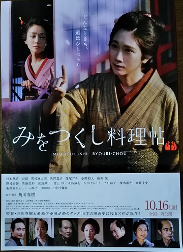 先日当選したスポーツ報知特選試写会「みおつくし料理帖」を観てきました。 8か月ぶりのスポーツ報知特選試写会でしたが、今までは自由席なので早めに行って並んで待つかたちなのですが、今回は開場時間から抽選して指定席です ということだったので、会場時刻の5分前くらいに行ったら、もうとっくに開場していたらしく、指定席とは言っても早く行った人の方がいい席だったようでしたくじ運が悪く思いもしないほど端っこの席で、がっかりしました。会場の東京エレクトロンホール宮城は映画館ではないので、スクリーンが小さく、端までスクリーンがあるわけではないので、少し残念でした。ベストセラー小説だし、テレビドラマにもなっているので、ストーリーはそれなりに知られているとは思うけど、若い二人の女優さん(松本穂香さん・奈緒さん)を豪華なベテラン俳優が脇を締めているといった感じでした。久しぶりに見た(私は)窪塚洋介さんや、面白い部分担当の藤井隆さんも良かったし、奈緒さんの花魁もきれいでした。偶然会った支部で一緒の友人が、後で「床の間の花が小原流だったね!エンドロールにも伊藤庭花先生の名前が・・・」と。えらい私はそのライン見てから「床の間?そういえば太夫の部屋にあったかも?」という情けない話です10/16公開です。小原流の方は注目してみてください。私はもう1回見ることができたら気をつけますそして、試写会の時に恒例だったその後の食事も半年以上ぶりに、短時間で楽しんできました。お店はお客さんが少なかったです。こっちも見てね「いけばな日記」にほんブログ村 いつもありがとうございます。今日もポチッとお願いします