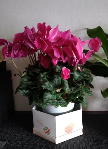 毎年お花屋さんからお歳暮代わり!?にシクラメンの鉢を頂きます。昨年末にいただいたのはでした。白に縁だけ濃ピンクなどが多かったし、赤もあったのですが、このワインレッドのような色は初めてかもしれません。いつもお稽古の花を注文していますが、お花代は実費でいただくので、実際にお花を購入しているのはお弟子さんたちになります。それで毎年私が頂いていますので、本当にありがとうございますこっちも見てね「いけばな日記」にほんブログ村 いつもありがとうございます。今日もポチッとお願いします