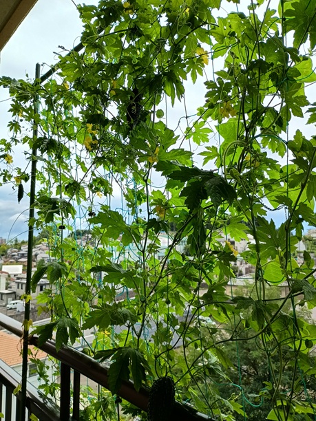 今年も緑のカーテンやっています今年もまずはゴーヤやはりこれは日よけとしても一番良いし、食べれるしベストですね そして、朝顔これも日よけとしてはかなり良いです。ゴーヤの葉に埋もれるようになっている部分もありましたが、花は最高で1日に40輪暗い咲いていた日もありました 今年もつるいんげんの種もまいてみました。マメ科なので花が可愛いのですが、今年の花は白でしたピンクの時が可愛かった。つるが伸びて葉も割と大きいのですが、終わったところから葉が落ちてしまうのです 一番暑い時に葉がなくなってしまっては日よけにならないと思い少しずらして種をまいたのですが、ゴーヤがどんどん伸びて広がってきて、その中に埋もれてしまいました。遅く蒔いたので、実がまだなりませんこっちも見てね「いけばな日記」にほんブログ村 いつもありがとうございます。今日もポチッとお願いします