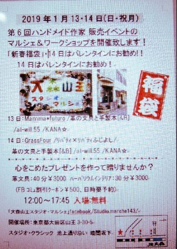2019年1月13日日曜日、14日祝月曜日 第6回大森山王スタジオ・マルシェ開催。ハンドメイド作家さんの出展販売&ワークショップです。 今回は革製品の教室とハーバリウム教室があります。〈入場無料〉 12:00~17:45 お教室は約40分 ¥3000 FB「大森山王スタジオ・マルシェ」サイト内のご予約ツールがあります。サイト内に当日割引きあ¥500ご利用頂けます。