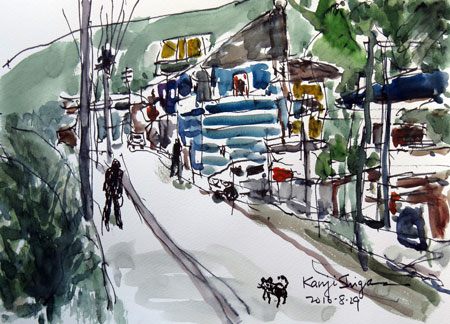 ここは藤沢の鵠沼海岸商店街の路地です。この路地はこの前の路地と違って比較的新しい民家が建っています。買い物帰りでしょうかひとりの女性が歩いています。この路地にはお店がありません。雨上がりで水たまりがあります。良かったら応援してね。一日一回ここをクリック!静物水彩画はここをクリックしてください。>>見たくなる水彩画・カンジの絵の世界「構図で失敗しないために」はここをクリックしてください。>>カンジの絵画ノート Blog当ブログの風景スケッチと風景写真をこちらで公開しています。>>KAN ART ギャラリー