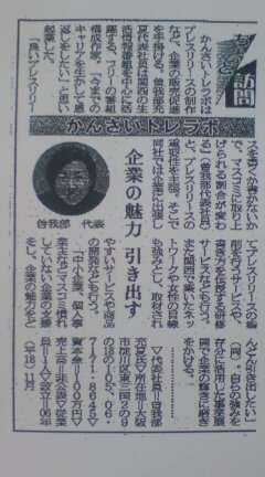 2007年も残すところあとわずか。。。そんな1年の振り返りをしてたら、こんな嬉しいお知らせが!!!「御社について、明日、新聞に掲載させていただきます!」そうそう!そういえば、取材されてました~~~☆いつ載るのかな???もう載った???やっぱ、ボツになったか。。。???そう思ってたら、担当者の方からお電話いただきました!ありがとうございます!!!今日、12月11日(火)の日刊工業新聞に掲載です!プレスリリースの添削など、わが社のサービスについても触れてくださっています。機会がございましたら、また、見てやってくださいまし!