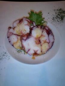 134席あるそうですが、座席がほぼ満席!!活気ムンムンな中、奥のほうに通されて、「シェフのおまかせコース」をいただきました。前菜2品(画像は最初の一品<タラの冷製トリュフロール カラシ酢味噌のソース>)、魚料理2品、お肉1品にお寿司とデザートの7品で12,000円です。まぁはっきり言えばお高いですが、世界で活躍しているノブ松久さんもいらっしゃって、最後に写真を撮ったので、記念でよかったかな、と思います。和がメインに、洋の料理を和っぽく仕立ててる・・そんな感じです。最初は季節のフルーツ(今日はマンゴーでした)のシャンパンをいただいたのですが、これは絶品!マンゴーのフレッシュさがさわやかです。次は悩んで、グラスのソービニヨン・ブランを。お昼にしっかり飲んだので、夜は控えめにアルコール2杯で終了。一旦ホテルに戻ってチェックイン、これから≪バール・デル・ソーレ≫に行ってきます。【5/16】更新前菜2品目 圧縮したタコのカルパッチョタコがむっちりしてて、なかなか美味しい。サラダ系 炙りマグロと焼きホタテのサラダ 松久特製ドレッシングでマグロは殆ど見えないけど、しっかり分厚いのが3切れ入ってます。そしてホタテもとっても食べ応えのある大きさでした。ソフトシェルクラブの春巻き見た目がいまいちだったんで画像はナシ。だけどカニの風味が生きてて味わいは良かったです。メニューを見てMさんはコレを注文してみたかった、と言ってたので出てきてよかったですね。お肉系 牛フィレ肉のガーリックスパイスソース柔らかいお肉でスタンダードに美味しかったです。ご飯モノはお寿司、ネタは右から。 中トロ、クエ、シメサバ、イカ、アナゴシメサバと、特にアナゴが美味しかったです。デザート、これも右から。 クレームブリュレ:抹茶・トリュフ・黒ゴマあまりデザートは食べませんでしたが、とてもクリーミィで意外と美味しく、真ん中のトリュフ風味は半分も頂いちゃいました。この後、ドリンクは付いてないのでコーヒーを注文し、最後に松久さんと写真を撮ってきましたが・・そのアップはやめときます。お店の雰囲気、活気はかなりいい感じです。価格を考えると次はないかもしれませんが、東京に住んでいたら、話題の店だし、接待などに使うのはいいかもしれません。簡単に天麩羅とか食べたいなら、いちおうご飯と味噌汁などが付いて、確か3,500円くらいで見ニューにのってたので、コースを頼まなくても、夜にもイケそうです。