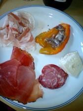 さて、割愛しようと思いましたがEU内移動の1時間でも軽食が出るのでご紹介。 小さなサンドにチョコのお菓子付き。帰りの便でも同じスタイルで出されました。チキンとチーズが選べるようですが、行きは無条件にチキンが。チーズ売り切れだったのかな~・・。ミラノに着いたら夜ご飯を食べるので、どうしようかと思ったのですが、パンが意外と美味しいんですよね~。3/4くらい食べて、チョコはお持ち帰りしました。さて、マルペンサ空港へは20分ほど遅れて(出発が15分遅れた)到着しましたが、荷物はすんなり出てきたので18時半頃にはミラノ行きのバスに乗り込んで、渋滞に少し巻き込まれつつ19時40分頃に駅に到着。ホテルは駅から5,6分の場所なのですが、久しぶりの一人行動、少し迷いつつ20時過ぎにチェックイン。荷物を置いて、一息着いて、晩ご飯のお店探し。ガラにもなく、少しオッカナビックリでホテル周辺をウロウロ。地図でチェックしたお店は見当たらず、1時間ほど歩き回って現地の人でにぎわってるお店に21時半過ぎに入り、前菜のバイキングとお肉の網焼きの盛り合わせと、ピッコロサイズな赤ワインを注文。 牛肉以外に鳥や羊や3種類のソーセージ(一つはレバー系)など見た目はよさげなプレートが到着。だけど・・フツーな網焼きで、ちょっと焦げたところは単に焦げの味がするだけで、あまり期待したほどではなかったし、家で朝ご飯を食べてから出かけてこの日は6食目になるわけで、さすがに胃が疲れて半分以上残してしまいました。この残念さが、翌日すぐにトリノに移動せず、美味しいリゾットが食べたい!なんて気持ちにさせたのです・・。
