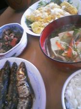 イワシ、卵焼き、煮物の残り、汁物でお腹いっぱいです。