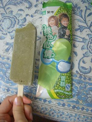 これはタイタイが好きなアイスの一つです♪味は、緑豆。春雨によく、゛緑豆春雨゛ と書いてありますよね?あの、緑豆でできたアイス。味は美味しい♪それに、値段は1元。(約15円でおつりが来る)すんごい魅力じゃないですか??去年は、ただの緑豆の絵だったんだけど今年は、人気歌手の絵がトッピングされて載っています。小豆もあるけどチョッと味が薄い。つまり、甘いんだかなんだかはっきりしないのであまり食べてないのが本音。今年は特に、アイスの種類が増えた気がする・・。カルフールに行くとずらりとアイスがオンパレードに並んでいます。歩きながら食べるのにはもちろん一つ買うだけでいいですが家で食べる用だと6個~15個くらい袋に入っているものを買っています。