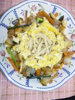 野菜炒めと卵をのっけて、だしつゆをかけて出来上がり♪