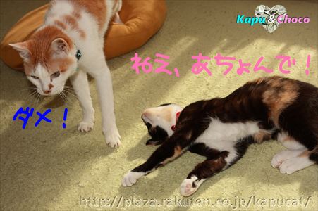 まだまだ寒い日が続きますね。風邪などひかぬように、体調管理には気を付けましょう。 さて、今回は特に何も有りませんでしたので、我が家のニャンコ達の様子を撮ったばかりの写真でご紹介いたします。 我が家に来て半年が過ぎた「チョコ」ちゃん。生後半年を過ぎているのですが、まだまだ赤ちゃんが抜けません。 いつもの様に甘える「チョコ」ちゃん「カプ」は無視してお出かけの様子 すると「チョコ」ちゃんは、その後追いかけようとします 一方「カプ」が向かった先は? これには「チョコ」ちゃんも少々呆れ気味 「カプ」が動くと、その後を必ずついていく「チョコ」ちゃん。まだ時々「カプ」のオッパイをしゃぶっている「チョコ」ちゃん。昼間、寝るときは「カプ」にピッタリ寄り添い寝ている「チョコ」ちゃん。「カプ」と一緒にいる時が一番安心できるようで、 本当の親だと思い込んでいるようです。 「チョコ」ちゃんが我が家に来て、一番良かったのは「カプ」かも知れません。