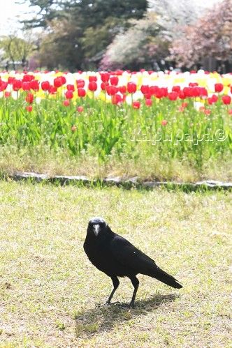 カラス君も春の日差しとチューリップに満足しているようでした。