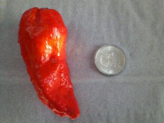 これホント、マジ辛すぎてやばいです。 みなさん、見たこと有りますか これが「本当の正体」・・・・・ 以前、日記(お題(誕生))にも掲載した世界一辛いと認定されているジョロキア 見た目は 大きくいびつな形でいぼいぼがあり 見たこと無いけど、悪魔のべろ見たい 生で見るとそんなに辛いのかと疑うかも でも、食べると すっ・・・・ごいです。お買い上げいただいた人で、おいしいですと言われる方もおられましたが8~9割りの方だ咳き込むなど、一度使うと手を出しません。 勇気のある方・イベントの罰ゲーム・普通の辛さに満足してない方・・・などぜひお試しください。 ※本当に辛すぎるので使用に注意が必要です。