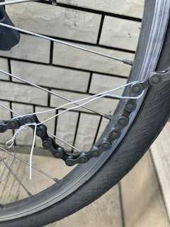 作業しやすいようにチェーンを緩めるチェーンフッカーがないので、針金で代用しました。