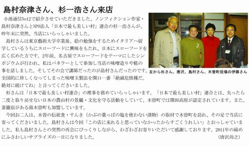 木曽町で手造りの味噌玉製法で麹味噌を作っている小池麹店の唐澤さんから小池通信が送られて来た。昨年の11月末に、スローフードの草分けでノンフィクション作家の島村奈津さんと、木曽スンキの取材に出掛けた時に、小池商店を訪問していた。木曽のスローフードと言えば、小池糀店の唐沢さんが仕込んだ玉造り2年熟成味噌、そして塩を一切使わず赤カブの葉と茎を乳酸発酵させた漬物「すんき」どちらも、自宅に持ち帰って楽しんだ。島村さんと唐澤さんは旧知の間柄で、再会を喜び合っていたが、その時の様子が紹介されていた。