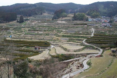 星野村での2日目。朝6時に池の山荘に隣接する星野温泉きららの「もりの湯」の露天風呂へ、緯度が東京とは約2度違うので夜明けは遅く未だ真っ暗で、外の景色を楽しむ事は出来ず。雪がぱらつく天候なので、予定を変更して、棚田や花木園、比較的標高の高い茶園パイロットなどの現地視察を先にする事にして、宿を出発。今回のレンタカーは普通タイヤだったので、雪の状況に依っては、早めの脱出も想定せざるを得ないとの判断。最初の訪問場所は鹿里(ろくり)の棚田。星野村の棚田と言えば、棚田百選に選ばれた広内・上原の石積棚田の知名度が高いが、鹿里の棚田は天空と彼岸花のスケールの大きさで人気急上昇中。地元の人々が展望場所の駐車場の整地や棚田の保全に注力されて来た事もあり、訪問者が増えて来た。棚田では米以外に、ヒノキなどの観賞用の花木も栽培されている。 次いで、椋谷の花木園へ。星野村では製茶業の茶畑以外に、観賞用の花木を育てている花木畑を随所に見掛けるが、ここ椋谷には日当たりの良い傾斜地一面に大規模な花木畑が広がっていた。赤茶色の葉を付けた馬酔木の畑では、冬が出荷時期の様で、間引かれた跡が残り、白い雪と赤茶のコントラストが綺麗だった。 花木園を後に、星野村では高地に属する耳納連山に連なる当に天空の茶畑と呼ぶに相応しい、広大な茶園パイロットに向かう。ドイツ人のワイン農家のメンバーならば、母国の葡萄畑のイメージに重成ったのでは。お茶に最適な標高は200~400Mと聞いたが、フランスで聞いたワイン栽培に最適な標高200~400Mと重なっている。 パイロット茶園を後に、星野村の「日本で最も美しい村協議会」の高木会長の茶畑を2ヶ所巡った。 長大な谷沿いに棚田が続き、上部の上原棚田を経て広内のロードパークに下った。観光スポットに成った広内の石積棚田の展望場所には、星野村の最も美しい村協議会のポスターも。 わがまちにこの料理あり、この商品ありの取材をする茶の文化館に行く前に、昨夜急遽お願いした星野小学校に寄る事に。昨夜の夕食時に、美しい村の美しい学校づくりの議論をして、地域で育てる教育で学力日本一の東成瀬村や森の幼稚園の智頭町の事例を話し、最も美しい村を副読本に取り上げている、大蔵村や美瑛町の紹介をした。星野村も現在は人口3200名を切り、旧4学区を統合して、現在は一小学校、一中学の単独校。全国から1年間の山村留学生を受け入れ、米国のネバダからの留学生も来ているとの話を聞いて、是非星野小学校を見たいとお願いをしていた。星野小学校の秋山校長のご厚意で、木造校舎の星野小学校を見学させて頂き、話を聞かせて頂いた。 現在生徒数は143名で、低学年の生徒数の方が少ないのが気に成ったが、制服姿の子ども達の集中して学んでいる姿が印象的だった。茶の文化館に向かったが、この頃から雪の降り方が激しく成って来た。急いで、わがまちにこの料理ありとこの商品ありの写真撮影をスタート。料理には、悩んだ結果「しずく茶」を取り上げる事にした。「しずく茶」は、星野村が日本一の農林大臣賞に6度も輝いた玉露茶を、多くの人に楽しんで貰いたいと考案された玉露茶の魅力を引き出す飲み方であり、食べ方でもある。星野伝統本玉露に星野焼の湯器からお湯を注ぎ、蓋つきの茶碗を使って味わう飲み方で、皇風煎茶礼式の中にあるすすり茶作法にならって、茶の文化館発足時に考えられたもの。当初は、「すすり茶」でスタートしたが、お茶料理研究家がすすりの響きより、しずくが良いと提案、しずく茶に変更され、商品登録もされている。茶碗に玉露4gを山型に盛り、一煎目に45度前後のお湯20mlを茶葉の周りから注ぎ蓋をして90秒、蓋を押えて少しずらし、隙間からこぼれるしずくをすすり、口の中に広がるまろやかな甘みと深いコクを味わう。2煎、3煎と湯温と湯量を増やし、20秒後にお茶をすする。4煎目の残った茶葉は酢醤油をかけて食べる、瑞々しい新芽の歯応えが心地よく、ビタミン、ミネラルが豊富で栄養価も高い。次いで、わがまちにこの商品ありの撮影星野玉露のしずく茶、抹茶や抹茶オーレ、星野茶を使ったお菓子の抹茶大福、玉露饅頭、抹茶羊羹など。 昼食は、茶の文化館の星野茶寮で茶蕎麦・利休めしを食べた。 昼食後、予定より1H早く星野村を出発したが、雪が本降りの状態で、慎重運転を心掛けて星野村から八女市中心街へと下った。