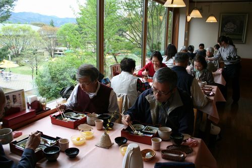 調布わいわいサロンの初の企画と成る宿泊バスツアー。「日本で最も美しい村」連合に加入の大鹿村、中川村への大鹿歌舞伎鑑賞とアルプス展望の旅に出掛けた。生憎の雨交じりの天候だったが、雨を覚悟していた割には降られる事は無く、高速道路は往復とも空いて居て快適な旅が実現出来き、参加者の皆さんからは大満足したと好評だった。集合場所のたづくり裏には、全参加者21名が予定通り集まり、定刻に出発出来た。調布市街の遠方よりの参加者もいて、定時出発を危ぶんでいたが、幸先よい出足と成った。中央高速内で2度トイレ休憩をして、昼食場所の伊那市のかんてんぱぱガーデンに予定時間より1Hも早く到着。途中のサービスエリアで、昼食予約先のかんてんレストランのさつき亭にTELを入れて、1Hほど早く到着しそうだが、11時30分から食事が出来ないかと無理な電話を入れた。時間の有効活用のために、到着直後に21名分の食事が可能に成る様にお願いしていたのだが。伊那インターを出て再度TELを入れて、OKの返事が貰えた、さすが客先満足度の向上に常に励み柔軟性あふれるかんてんぱぱに感謝。昼食はヤマメと若鳥の塩焼き弁当の選択制。伊那食品の会長で、美しい村連合の塚越副会長もお忙しい中、顔を出して頂いた。不思議な縁で、亡くなられたご主人が塚越会長と高校時代の同級生のメンバーもおられて、ご一緒に記念撮影。塚越さんから、コーヒーを御馳走に成った。食後、かんてんぱぱガーデンで青野恭典さんの写真展や、野村陽子さんの植物細密画館を見学、かんてんぱぱショップで買い物と1H近くの時間を取った。かんてんぱぱから、中川村の米澤酒造に向かった。大鹿村が雨の天気予報で、一昨日米澤社長にお願いして、急遽、工場見学を受け入れて頂いた。4月19日に実施した今回のバスツアーの紹介を兼ねた講演会を開いた際に、米澤酒造のオタマジャクシの純米酒に興味を持たれた人も多かったので、営業時間内の訪問と成った。此処でも、仕事で外出直前の米澤社長に途中まで対応頂いた。中川村の飯沼棚田の美山錦を使ったおたまじゃくシリーズのネーミングやラベルの発案者の案内で、工場見学と試飲。今年の冬に仕込んだおたまじゃくしは品不足で購入出来なかったが、来年の予約をしたメンバーも多数いた。予定時間を大幅にオーバーして、興味を持って質問する人が続出、1H先行していたスケジュールが元に戻る程。米澤酒造を後に、大鹿村へ。桜の名所の大西公園に登り、大鹿村の大河原地区や明日の歌舞伎会場の大鹿村小学校の体育館を確認。大鹿村では、既に昨日雨の天気予報を受けて、歌舞伎会場を通常の大磧神社から大鹿小学校への変更を決めていた。神社の境内が雨でぬかるむ事も考えれば、妥当な早期判断と思われた。大西公園の3000本の桜は、ソメイヨシノは既に落花、八重桜は八分咲き。次いで、中央構造線博物館、大河原の和合地区のハナモモ民家の山下さんを訪問。山下さんは、ハナモモの種を拾って植え続け、大鹿村内でも有数のハナモモ民家に。一本のハナモモにピンク、白、赤のハナモモが咲く不思議な木で、種を植えたそうで接ぎ木では無いとの事。山下さんちの子犬のワンちゃんは可愛い、犬小屋も綺麗で絵に成る光景。今晩の宿泊先の中川村の望岳荘に向かう前に、山塩を買うために塩の里に寄ったが、残念ながら売り切れ。明日の朝、歌舞伎会場に来る前に再チャレンジする。宿には予定より若干早く、6時前に到着出来た。風呂に入って貰い、浴衣での懇親会、会場は椅子席をお願いした。懇親会の途中で、中川村の曽我村長が挨拶に来られた。品切れのおたまじゅやくし純米酒を差し入れて下さり、一同大喜び。懇親会の後は、各部屋での交流が続いた。