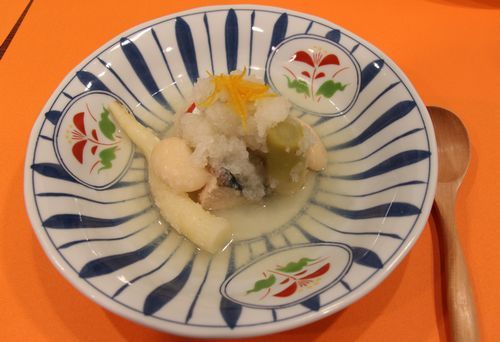 フランス繋がりの美しい村大好き仲間と仙川の蒔でランチ。千葉市、川崎市、江東区など遠い所から調布に来て頂き申し訳ない思いだったが、美味しい料理と楽しいおしゃべりで許して貰えたか。蒔の西岡シェフは、パリ6区の蕎麦懐石「円」の料理長を10年務めた後、帰国して創作和食の店「蒔」を開いた。見て楽しい、食べて楽しい、優しい味の和食が頂けるので、最近は親しい友人と来る機会が増えた。今日は自宅から30分歩いて仙川駅へ、此処で待ち合わせをして、店に向かった。京都産の細長い小型大根と鯖の雪見風の一皿に、鯛のこぶ締めお造り、かき揚げ、野菜の手まり寿司と4皿にデザートを楽しんだ。フランスの美しい村を70村以上巡っている0さん、欧州ツアーのコンダクターのKさん、フランス旅行の記憶が抜群のSさんなど、話題はフランスやイタリア他欧州旅行の思い出話が中心。既に連合準会員メンバーのOさん以外の3名の方に、「日本で最も美しい村」連合の準会員に登録頂く事に成った。