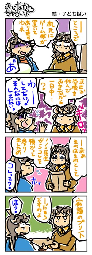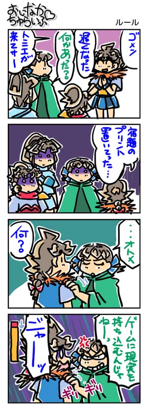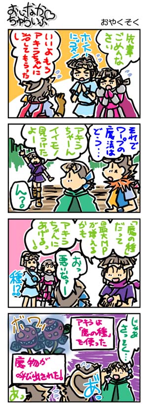 【3199本目!!】4コマのまとめページはこちら↑Webコミックランキングに参加していますデス。 よかったらクリックしてくださいませ。励みになります。*****************【ラクガキ】今日のラクガキ昨日のラクガキ*****************【カラーイラスト】「SOUKAIZAN」 ← New!!「THANKS 2015」「DRASLEFAMILY!!」 「GURUGURU!!」「THANKS 2014」 「THANKS 2013」pixivのページはこちら*****************どうも今晩は。みはちろ~デス。今日は買い物に行ってきました。ちょっとした食材と、プリンターのインクの予備を買いに、です。そしたら、ワタシが使っているプリンターのインク、売り切れてやんの。年賀状需要、恐るべし!……で、しょうがないので、詰め替え用のものを買ってきました。まぁ、以前から詰め替えで済ませていたので、いいんですけどね。少し安く上がるし。食材は、サラダ用の野菜とか、カップ麺とかを買ってきました。明日あたりには正月気分も抜けるので、普通の食生活に戻りたいですしね。は~。正月って、何なのだろう??? orz今日のラクガキのハナシ。日のラクガキは「グランゾート」の「グリグリ」「ハピ」「大地」「ガス」「ラビ」「V-メイ」を描きました。最初は昨日と同じように、正月っぽく、着物姿で描くツモリだったんですが……、イマヒトツだったのでやめました。ま、これが正解かなぁ~。明日もごちゃっと描く予定デス。そうそう。買い物に行ったついでに、中古のゲームを見てきました。ある3DダンジョンRPG(PSP用)の限定版が通常版と同じ「お求めやすい」価格で置いてあったので、購入してきました。帰宅後に中身を確認してみたところ、特典物は一通りそろっていた上に、予約特典も入っていました。……まぁ、箱にちょっと凹みがあったり、特典の冊子の一部に歪みがあったりするんですが……、それでも十分に美品で通用するレベルのものでしたので、大満足でアリマス。たまにこういうことがあるから、中古のゲーム屋あさりはやめられません。ハイ。といったところで、今日はこの辺で。また明日。