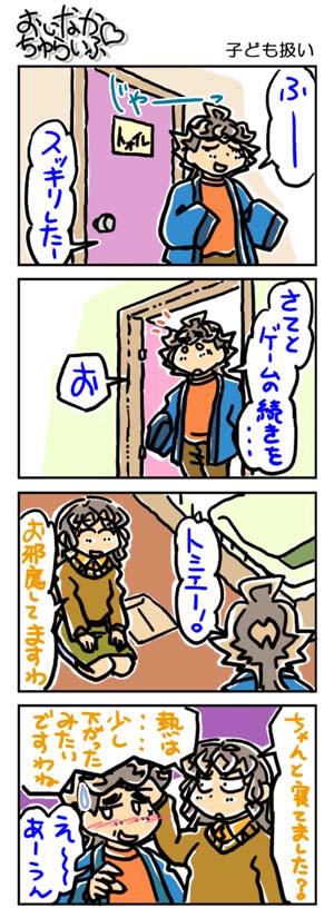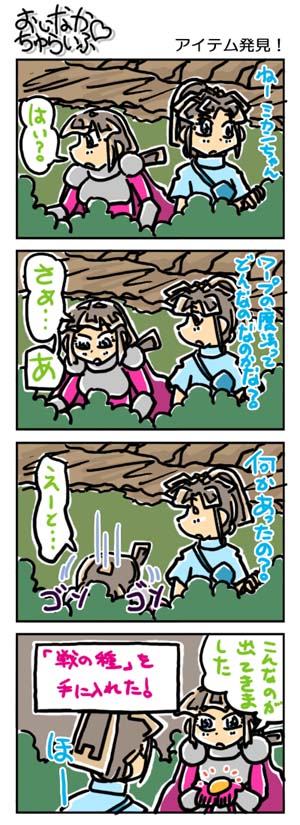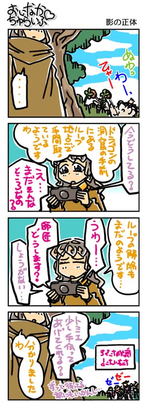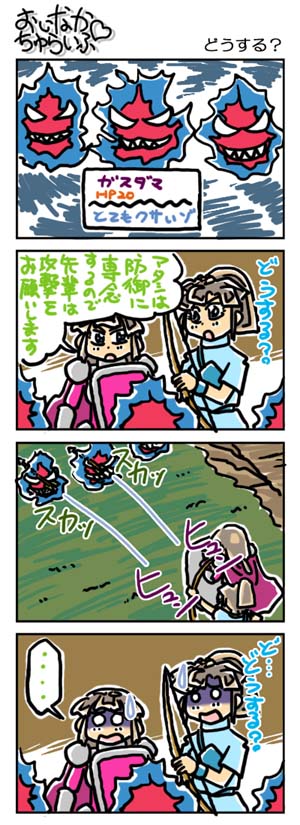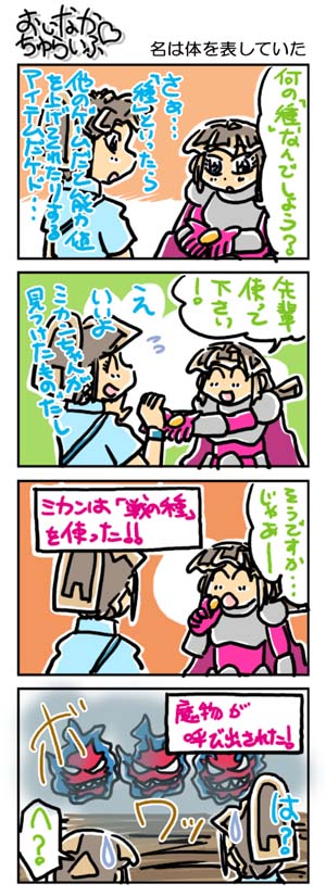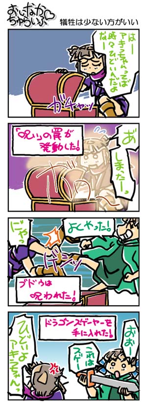 【3226本目!!】4コマのまとめページはこちら↑Webコミックランキングに参加していますデス。 よかったらクリックしてくださいませ。励みになります。*****************【ラクガキ】今日のラクガキ昨日のラクガキ*****************【カラーイラスト】「SOUKAIZAN」 ← New!!「THANKS 2015」「DRASLEFAMILY!!」 「GURUGURU!!」「THANKS 2014」 「THANKS 2013」pixivのページはこちら*****************どうも今晩は。みはちろ~デス。さて。ホントーに降るんですかねぇ~、雪。今のところは降っていませんが……これから冷えてきますからね。ん~。そういえば、最近、ゲームで遊んでないなぁ~。時々、中古のPSP用ソフトを買ってきたりはしますが……。ビミョーに忙しいのと、まとまった時間があっても、なんだかやる気が出ないというかなんというか……。その代わり、積んだままにしていた小説とかを読んでいます。何年かぶりに、活字の虫が湧いて出たよ~です。速読……には遠く及びませんが、そこそこの速度で読むことができるので、山積みの小説もだいぶ片付いていっております。これが終わったら、長編作品の読み返しでもするかなぁ~。今日のラクガキのハナシ。今日は「ワタル1」の「虎王」と「ドン・ゴロ」を描きました。出来は、ちょいビミョー。もう少しいい線を選べたよ~な気がしますデス。ハイ。んでは、また明日。