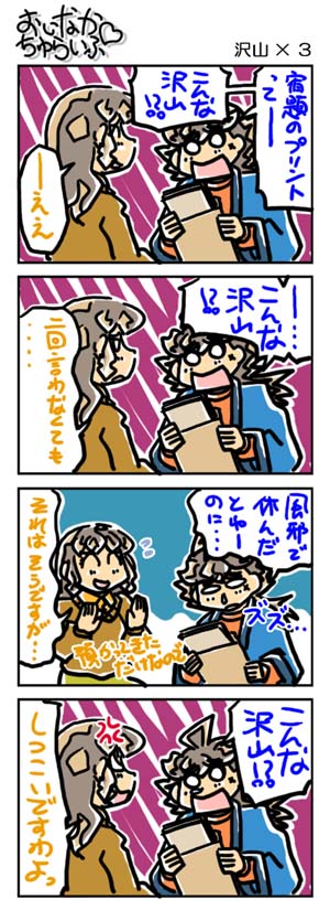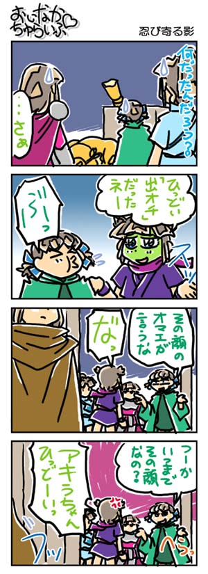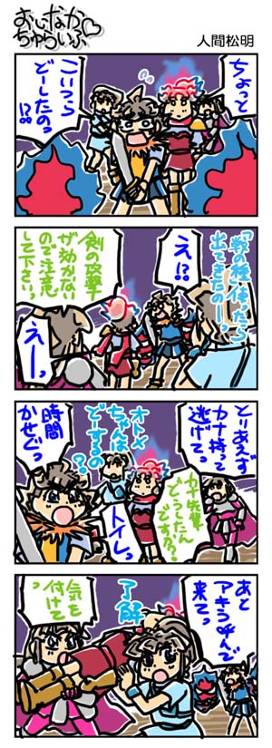 【3202本目!!】4コマのまとめページはこちら↑Webコミックランキングに参加していますデス。 よかったらクリックしてくださいませ。励みになります。*****************【ラクガキ】今日のラクガキ昨日のラクガキ*****************【カラーイラスト】「SOUKAIZAN」 ← New!!「THANKS 2015」「DRASLEFAMILY!!」 「GURUGURU!!」「THANKS 2014」 「THANKS 2013」pixivのページはこちら*****************どうも今晩は。みはちろ~デス。今日もお休みを貰っておりましたので、のんびり……したかったんですが、なんだか色々やることが溜まっていたので、それらを片付けていたら、一日が終わったといふカンジでアリマス。あ~、こうしてお休みが消費されていくのですね。orzんでもって、明日からお仕事でアリマス。は~。去年かなりガンバッタので、なるべくラクがしたいデスねぇ。(苦笑)最近の楽しみ。PSP用のゲームが、中古ショップで安く売られるようになってきましたので、ちょっとだけ欲しいなぁ~、と思ったソフトを見つけては購入する、ということをやっております。結構楽しいです。老後の楽しみも増えますしね。(ヲ? 笑)今のところ、RPGばっかりですが、アクション系にも手を伸ばすかなぁ~。まぁ、そういう買い物の前に、PSPの充電をして、遊べる状態にすべきなんですが……。今日のラクガキのハナシ。今日は「超幕末少年世紀タカマル」より「タカマル」「アル」「ミライ」「クロード」「ジロ」「カリン」「どすこい」を描きました。腕が限界に達しましたので、集合絵のラクガキは今日のでオシマイでアリマス。明日から通常通りのラクガキに戻ります。あ~、しんどかった~。(それなら、やらなきゃいいのに。笑)といったところで、今日はこの辺で。また明日。