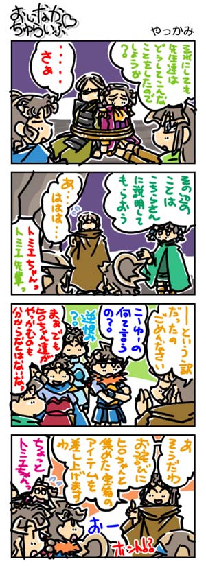 【3316本目!!】4コマのまとめページはこちら↑Webコミックランキングに参加していますデス。 よかったらクリックしてくださいませ。励みになります。*****************【ラクガキ】今日のラクガキ昨日のラクガキ*****************【カラーイラスト】「SOUKAIZAN」 ← New!!「THANKS 2015」「DRASLEFAMILY!!」 「GURUGURU!!」「THANKS 2014」 「THANKS 2013」pixivのページはこちら*****************どうも今晩は。みはちろ~デス。明日から連休という人も多いかと思いますが……ワタシにはそ~ゆ~ものはなく、普段通りのお仕事が待ち受けているのみでアリマス。うん。何を怨んだらいいのかしら??人?社会??世界???宇宙????まぁ、どれも一通り恨んでおくとして……今日は連休前ということで、色々と片づけをしました。かつて仕事で使っていた道具なんですが、ここ数年は放置していたものを捨てたり。書類や道具類を整理してみたり。……とても疲れたデス。あ~、のんびり温泉に浸かりたいな~。今日のラクガキのハナシ。今日は「グランゾート」の「ラビ」「グリグリ」「ハピ」を描きました。出来はちょいよろしくないデスね。は~。あ、そうそう。4コマの今やってるしり~ず、よ~やく終わりが見えました。長かったな~。んでは、また明日。