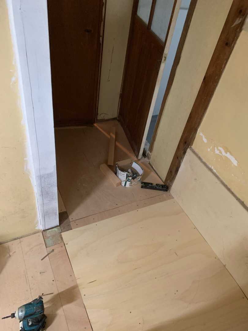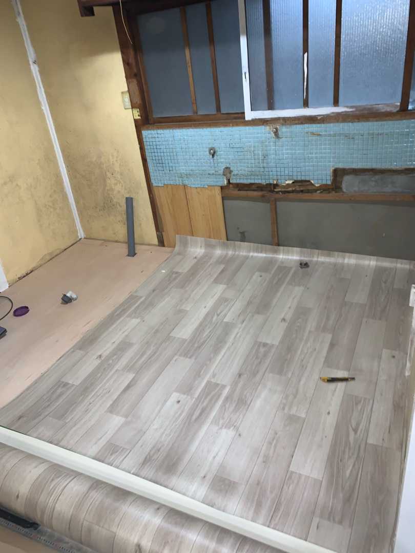 今日は、キッチンと諸々残りの床を貼っていきまして、