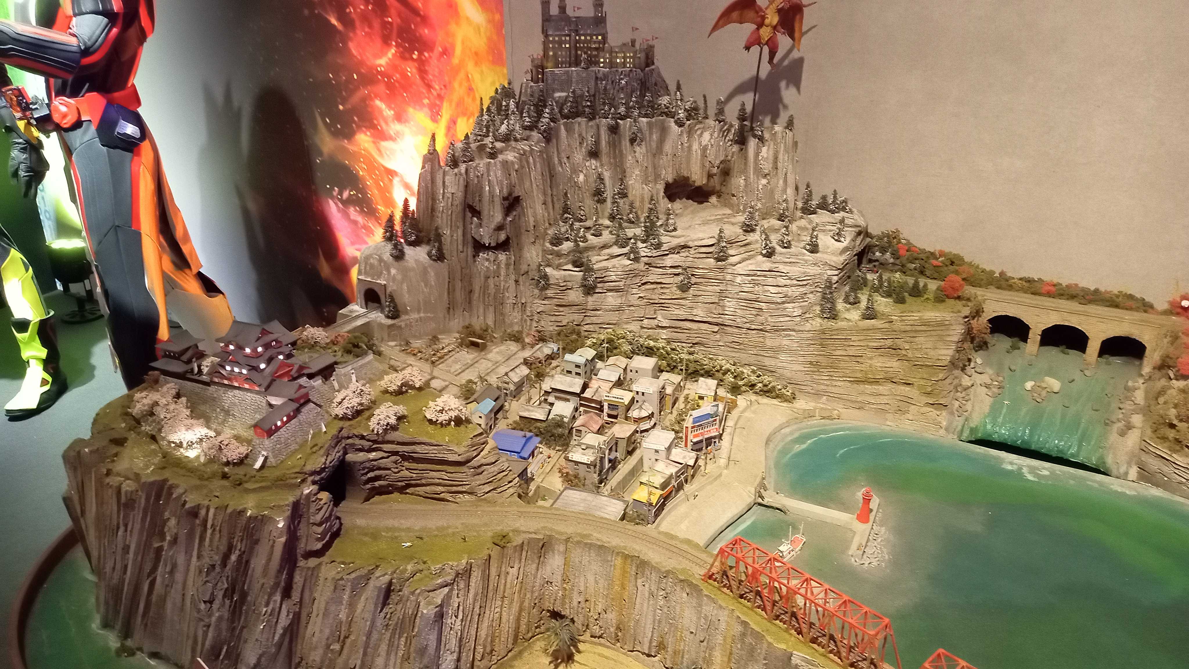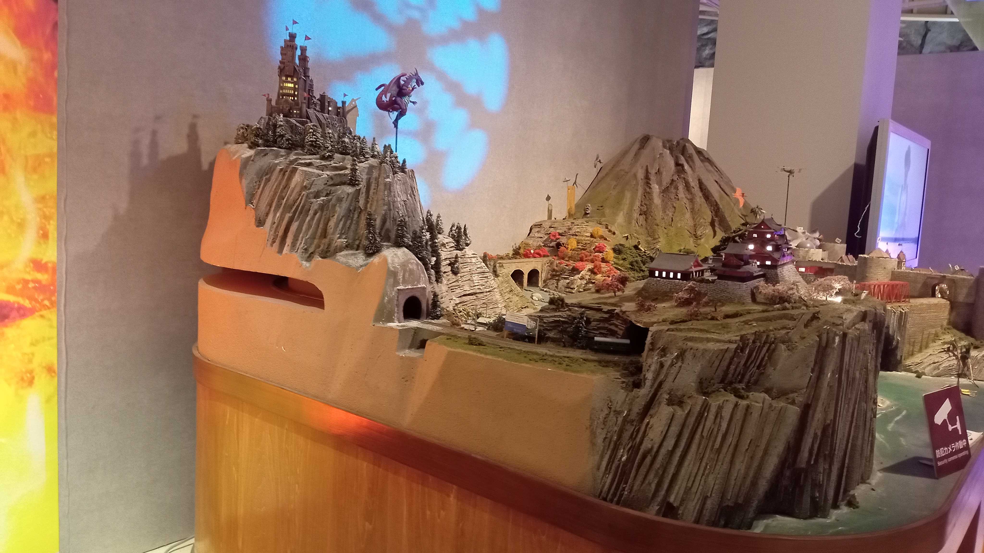 太秦映画村の大本命だったファンタジック本屋かみやまの中心に置かれた大規模ジオラマ 横のモニターでは柴崎貴行監督・デザイナーさん・神山飛羽真役の内藤秀一郎さんのムービーが流れるサービスが嬉しい
