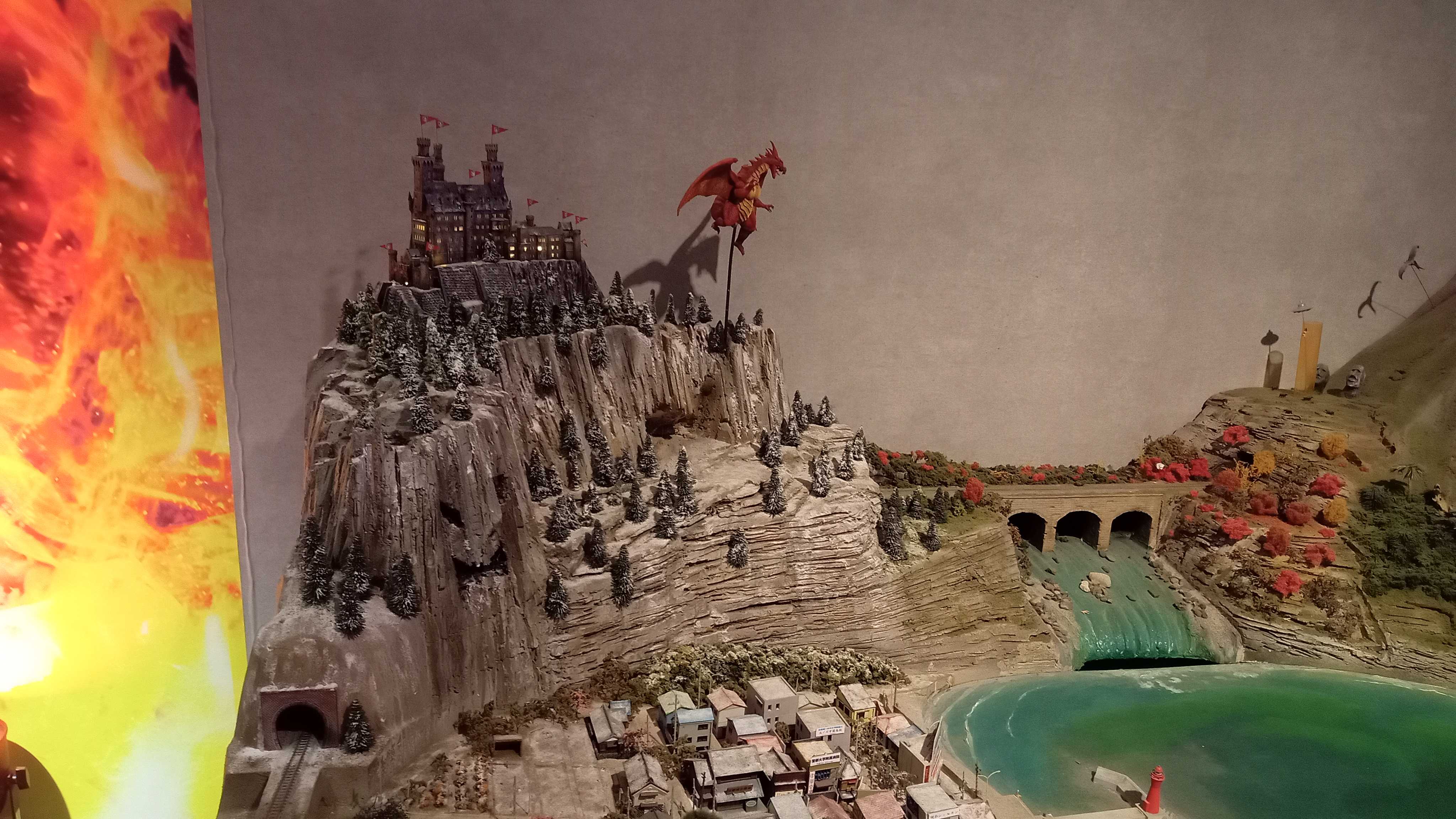 岩山の城とドラゴン、そして近代的な城下町 歴代ライダーの舞台が建物に記されているんだけどカメラの性能の都合で断念