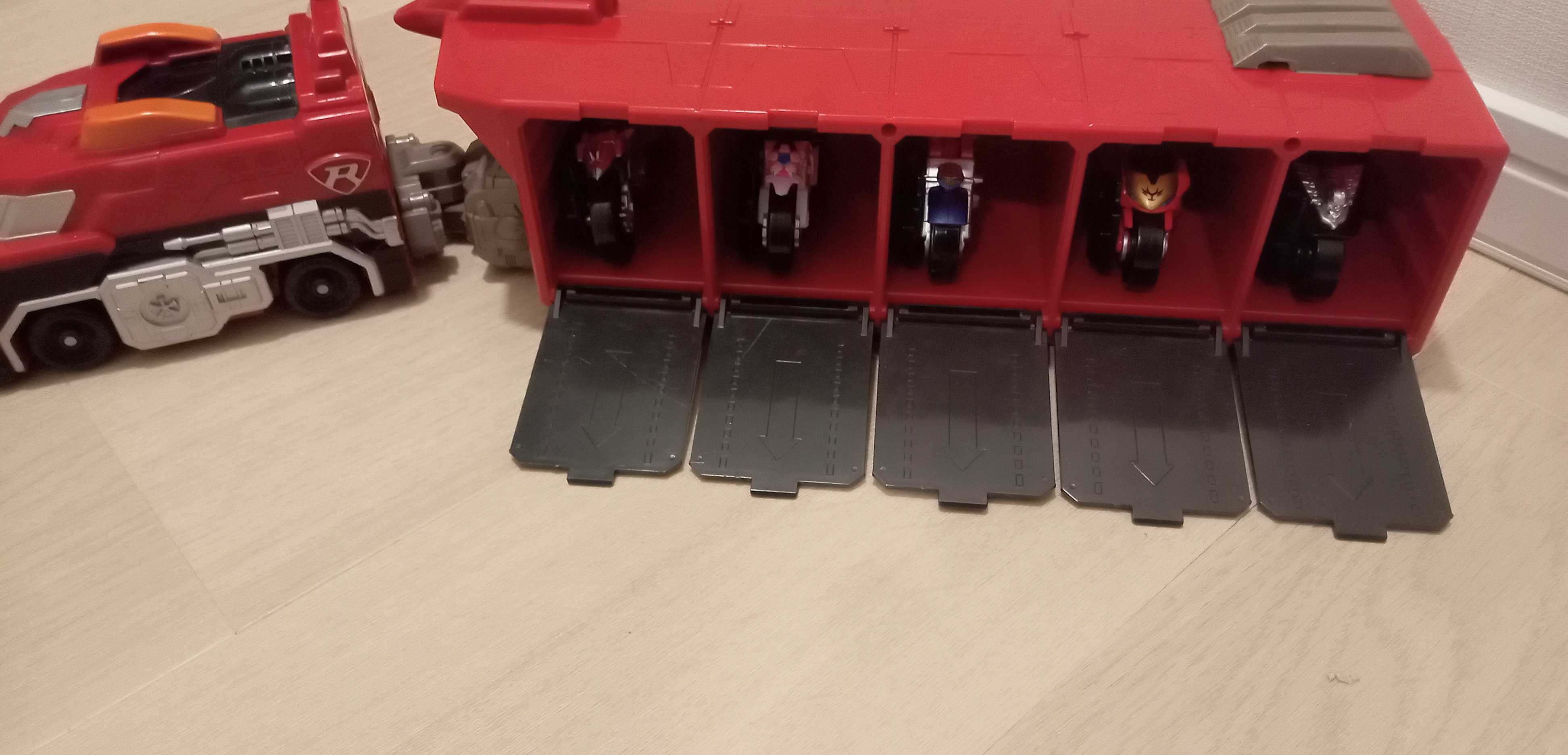 後方コンテナは元々ロボットのパーツ格納用として設計されたから無理すればトミカを2台格納可能