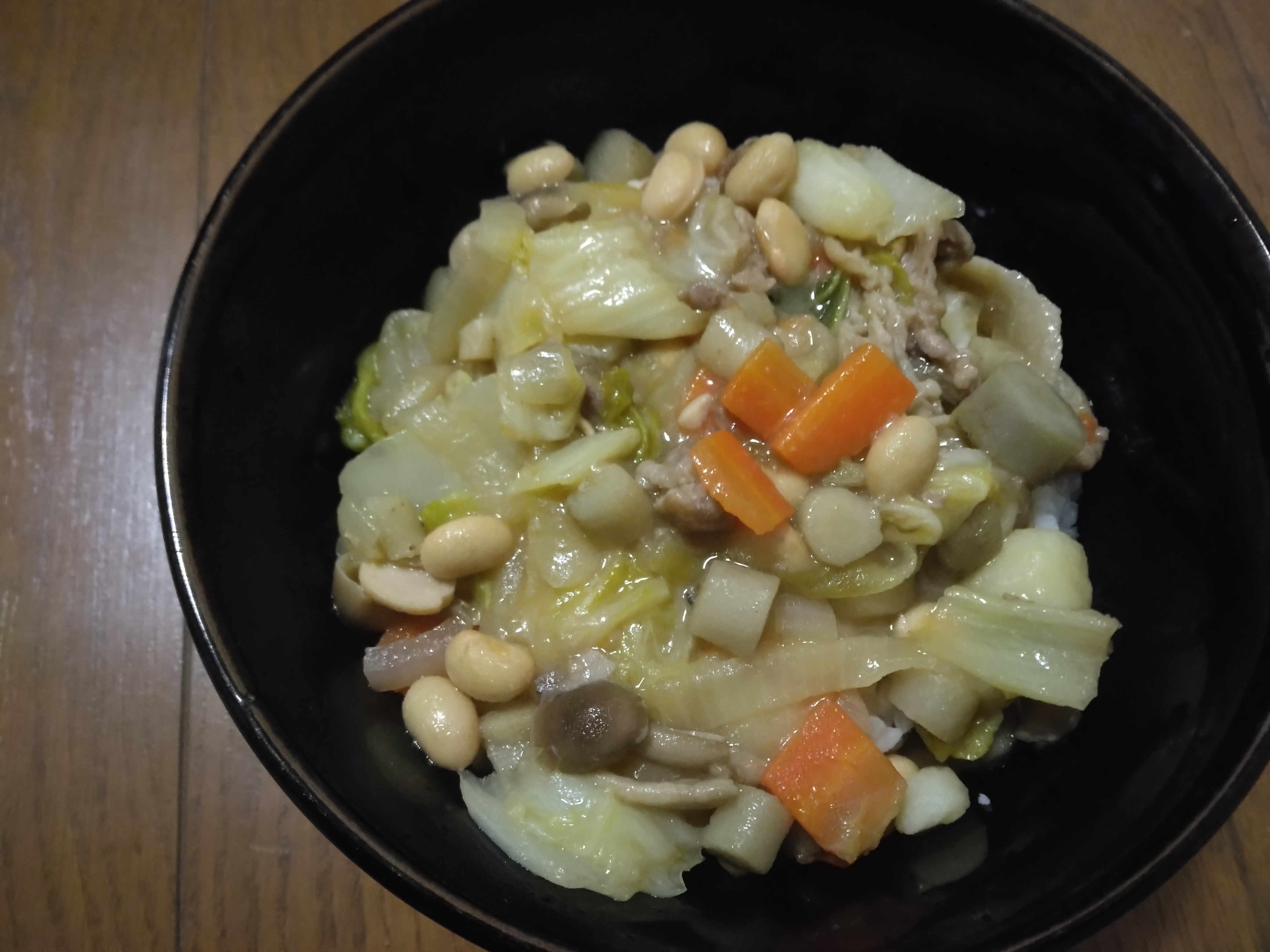 中華丼を作りました具材は豚肉、にんじん、玉ねぎ、じゃがいも、白菜、しめじ、しょうが、ごぼう、蒸し大豆を使いました豚肉をガラスボウルに入れて料理酒1/2杯、しょうが小さじ1杯、片栗粉小さじ1杯を入れて揉み込んで下味をつけました調味料は料理酒 大さじ1杯砂糖 大さじ1/2杯塩 1/3杯しょうゆ 大さじ1杯鶏ガラスープの素 小さじ1杯水 50ccを使いました水溶き片栗粉は片栗粉 大さじ1/2杯水 大さじ1杯を使いましたフライパンにサラダ油、しょうがを入れて熱したあと豚肉を入れて色が変わるまで炒めましたそこに具材を入れて野菜が柔らかくなるまで炒めたあと調味料を入れてしばらく煮たあと水溶き片栗粉をまわし入れてとろみがついたらごま油を少量加えて香りをつけたら完成です豚肉の下味もしっかりついていて美味しく出来ました