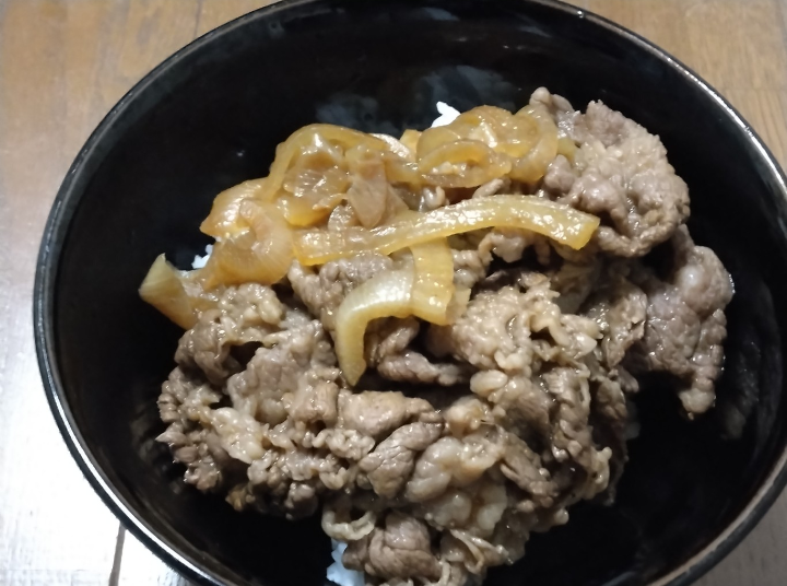 牛丼を作りましたフライパンに玉ねぎを入れて少し炒めたあと牛肉と焼き肉タレを入れて肉の色が変わって玉ねぎが柔らかくなるまで炒めました玉ねぎの水分で焼き肉タレがちょうど良い濃さになって美味しく出来ました