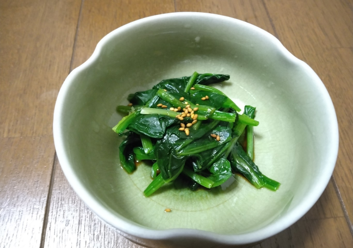 ほうれん草のおひたしを作りました鍋に水を入れて沸騰させたあと洗って切ったほうれん草を入れてしんなりしたらザルでお湯を切って完成ですゴマは今年収穫したゴマを使いました茹でるだけなので簡単ですね