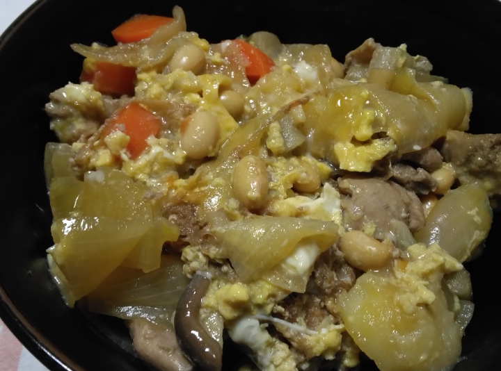 親子丼を作りました具材は鶏もも肉、にんじん、玉ねぎ、じゃがいも、しいたけ、蒸し大豆、卵3個を使いました調味料はしょうゆ 大さじ2杯みりん 大さじ1杯砂糖 大さじ0.5杯鰹節 適量を使いました水120ccを鍋に入れて沸騰させて火を弱めてから鶏もも肉を入れてアクが出てきたら取り除いて野菜と調味料を入れて野菜が柔らかくなるまで煮たあと卵3個をかき混ぜて半分を鍋に入れて固まってから残りの卵を鍋に入れて卵白が白くなり始めたら火を止めて完成です卵をもう少し半熟にしたかったですが美味しく出来ました