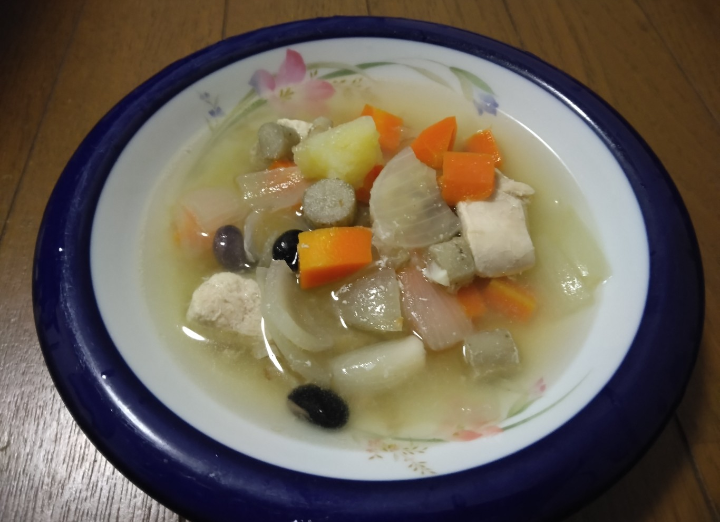 鶏肉のスープを作りました具材は鶏ムネ肉、にんじん、玉ねぎ、じゃがいも、ごぼう、蒸し黒豆を入れました鍋に水を入れて煮立たせてから具材を入れてアクを取ってから鰹節、白だし、コショウを入れて具材が柔らかくなるまで煮たら完成です鰹節の良い香りがして美味しく出来ました