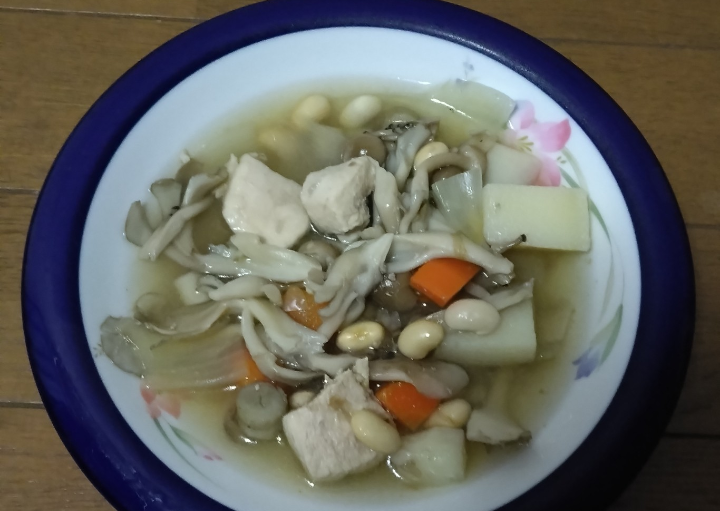 鶏肉と野菜のスープを作りました具材は鶏ムネ肉、にんじん、じゃがいも、玉ねぎ、ごぼう、マイタケ、しめじ、蒸し大豆、唐辛子、鰹節を使いました鍋に水を入れて沸騰させてから具材を入れて灰汁を取り除いてから鰹節を加え野菜が柔らかくなるまで煮ましたそこに白だしを味見しながらちょうど良い味になるまで少しずつ加えました最後にコショウを適量加えて完成です肉と野菜を切って煮ただけなので簡単に作れましたが美味しく出来ました