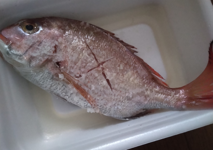 オーブンで真鯛の塩焼きを作りました下処理されている真鯛を買ってきて身にバツ印の切り込みを入れて身とお腹の中に、塩、料理酒をふってすりこみましぴったりとラップをして約15分常温でラップを取って軽く水気を拭き取りオーブン用のトレーにクッキングシートを敷いて鯛をのせましたオーブンで200℃で20分、180℃に落としてさらに15分焼きました皮の表面がパリッとしていて塩味もしっかりついていて美味しく出来ました