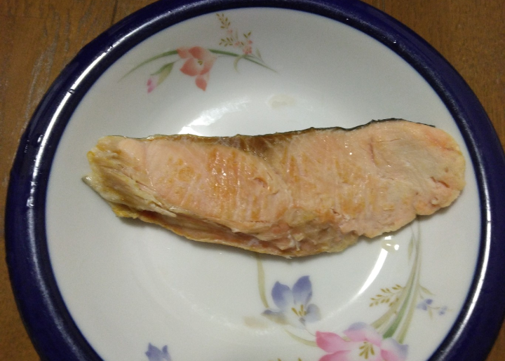 甘口の塩鮭を焼きましたフライパンにキッチンペーパーを敷いて鮭の切り身を入れて蓋をして両面焼きましたちょうど良い塩加減で美味しかったです