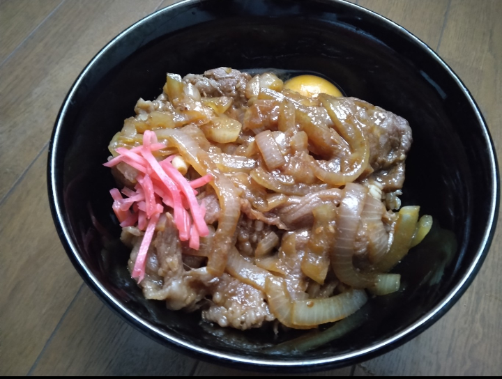 牛丼を作りました熱したフライパンに玉ねぎと牛肉を入れて焼き肉のタレと水を少し加えて玉ねぎがしんなりするまで煮てご飯の上にのせて生卵と紅しょうがを入れたら完成です焼き肉のタレを使うと簡単に美味しく作れるので良いですね